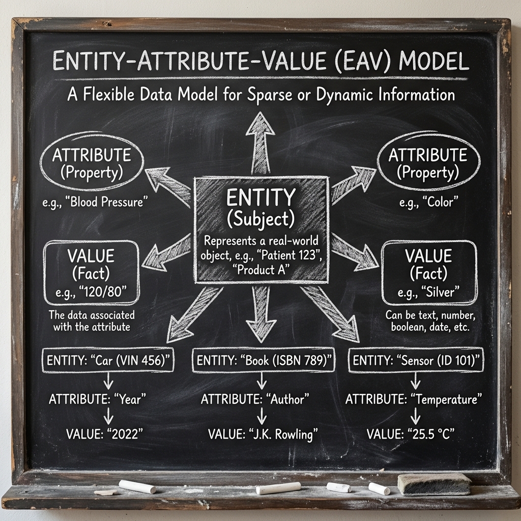 The Entity-Attribute-Value (EAV) model is the atomic structure of the Knowledge Graph, organized into Triples that define the world.